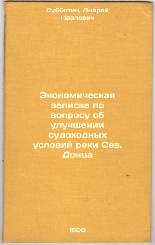 Short description: In Russian. Subbotin, Andrey Pavlovich. Economic Note on Improving Navigation Conditions of the North Donets River. Ekonomicheskaya zapiska po voprosu ob uluchshenii sudokhodnykh usloviy reki SevDontsa. In Russian /Economic Note on Improving Navigation Conditions of the North Donets River. The image is provided for reference only. It may reflect condition of one of the available copies or only help in identifying the edition. Please feel free to contact us for a detailed description of the copies available. SKU3694604