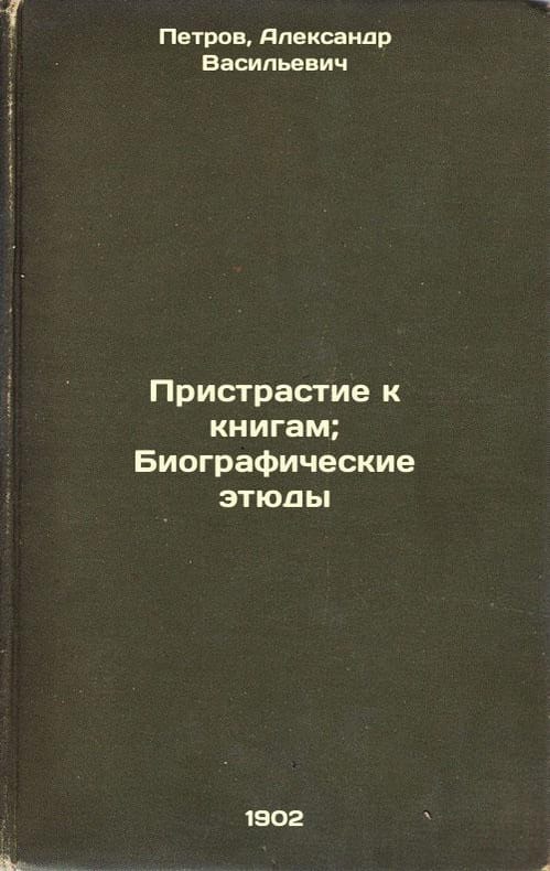 "Short description: In Russian. Petrov, Alexander Vasilievich. Addiction to books; Biographical sketches. St. Petersburg: type. E. Arngold, censorship. 1902. Pristrastie k knigam; Biograficheskie etyudy. In Russian /Addiction to books; Biographical sketches. The image is provided for reference only. It may reflect condition of one of the available copies or only help in identifying the edition. Please feel free to contact us for a detailed description of the copies available. SKU3707442"