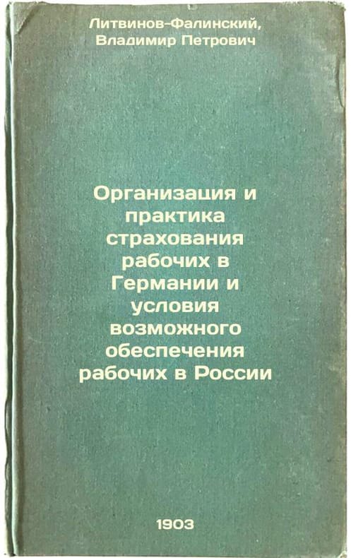 Short description: In Russian. Litvinov-Falinsky, Vladimir Petrovich. Organization and practice of insurance for workers in Germany and conditions of possible coverage for workers in Russia. St. Petersburg: type. A.S. Suvorina, 1903. Organizatsiya i praktika strakhovaniya rabochikh v Germanii i usloviya vozmozhnogo obespecheniya rabochikh v Rossii. In Russian /Organization and practice of insurance for workers in Germany and conditions of possible coverage for workers in Russia. The image is provided for reference only. It may reflect condition of one of the available copies or only help in identifying the edition. Please feel free to contact us for a detailed description of the copies available. SKU3714023