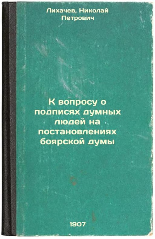 Short description: In Russian. Likhachev, Nikolai Petrovich. On the question of signatures of stupid people on resolutions of the Boyar Duma. St. Petersburg: type. I.N. Skorokhodov, 1907. K voprosu o podpisyakh dumnykh lyudey na postanovleniyakh boyarskoy dumy. In Russian /On the question of signatures of stupid people on resolutions of the Boyar Duma. The image is provided for reference only. It may reflect condition of one of the available copies or only help in identifying the edition. Please feel free to contact us for a detailed description of the copies available. SKU3741651