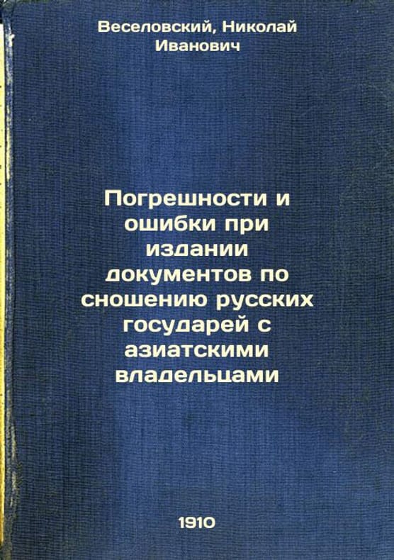 Short description: In Russian. Veselovsky, Nikolai Ivanovich. Errors and Errors in the Issuance of Documents on Relations of Russian Sovereignty with Asian Owners. Pogreshnosti i oshibki pri izdanii dokumentov po snosheniyu russkikh gosudarey s aziatskimi vladel'tsami. In Russian /Errors and Errors in the Issuance of Documents on Relations of Russian Sovereignty with Asian Owners. The image is provided for reference only. It may reflect condition of one of the available copies or only help in identifying the edition. Please feel free to contact us for a detailed description of the copies available. SKU3766081