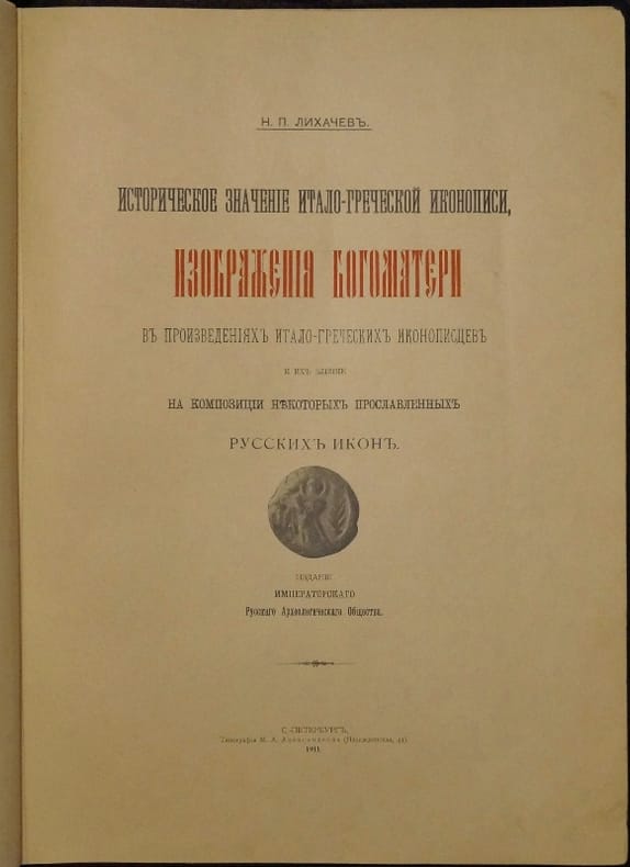 Short description: In Russian. Likhachev, Nikolai Petrovich. Historical significance of Italian-Greek iconography, images of the Mother of God in the works of Italian-Greek iconographers and their influence on the compositions of some Orthodox Russian icons. Saint Petersburg: Imp. Russian Archaeological Museum, 1911. The image is provided for reference only. It may reflect condition of one of the available copies or only help in identifying the edition. Please feel free to contact us for a detailed description of the copies available. SKU3780881