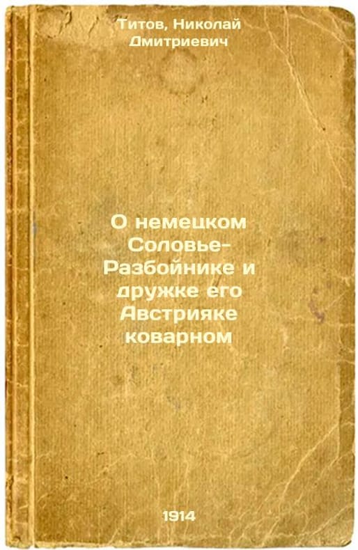 Short description: In Russian. Titov, Nikolai Dmitrievich. About the German Rogue Nightingale and his treacherous friend Austria. Moscow: Types of Ryabushinskoye, 1914. O nemetskom Solov'e-Razboynike i druzhke ego Avstriyake kovarnom. In Russian /About the German Rogue Nightingale and his treacherous friend Austria. The image is provided for reference only. It may reflect condition of one of the available copies or only help in identifying the edition. Please feel free to contact us for a detailed description of the copies available. SKU4196515