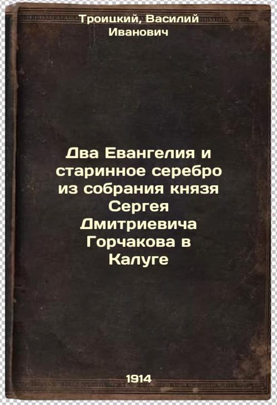Short description: In Russian. Troitsky, Vasily Ivanovich. Two Gospels and Ancient Silver from the Collection of Prince Sergei Dmitrievich Gorchakov in Kaluga: Moscow: Archaeological Int., 1914. Dva Evangeliya i starinnoe serebro iz sobraniya knyazya Sergeya Dmitrievicha Gorchakova v Kaluge. In Russian /Two Gospels and ancient silver from the collection of Prince Sergei Dmitrievich Gorchakov in Kaluga. The image is provided for reference only. It may reflect condition of one of the available copies or only help in identifying the edition. Please feel free to contact us for a detailed description of the copies available. SKU4196696
