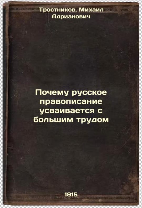 Short description: In Russian. Trostnikov, Mikhail Adrianovich. Why Russian spelling is difficult to assimilate. Yuryev: ed. August, 1915. Pochemu russkoe pravopisanie usvaivaetsya s bol'shim trudom. In Russian /Why Russian spelling is difficult to digest. The image is provided for reference only. It may reflect condition of one of the available copies or only help in identifying the edition. Please feel free to contact us for a detailed description of the copies available. SKU4199257