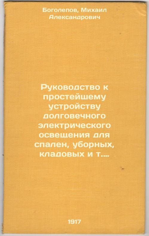 Short description: In Russian. Bogolepov, Mikhail Alexandrovich. Guide to the simplest device of durable electric lighting for bedrooms, latrines, pantry, etc., and temporary lighting effects. Moscow: type and zinc graphics of the trading house Mysl, 1917. Please feel free to contact us for a detailed description of the copies available. SKU4216012