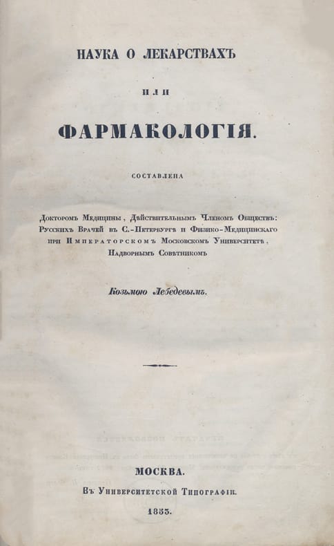 Short description: In Russian. Lebedev, Kozma Vasilyevich. The Science of Drugs, or Pharmacology. Moscow: 1853, Univ. Type. The image is provided for reference only. It may reflect condition of one of the available copies or only help in identifying the edition. Please feel free to contact us for a detailed description of the copies available. SKU4437060