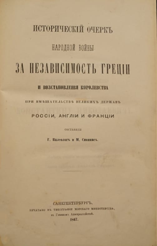 History of the People's War for Greek Independence and the Restoration of the Kingdom with the intervention of the Great Powers of Russia, England, and France In Russian/Istoricheskiy ocherk narodnoy voyny za nezavisimost' Gretsii i vosstanovleniya korolevstva pri vmeshatel'stve velikikh derzhav Rossii, Anglii i Frantsii. In Russian. Paleologist, Georgy Nikolaevich. Historical sketch of the people's war for the independence of Greece and the restoration of the kingdom with the intervention of the great powers of Russia, England and France. St. Petersburg: 1867, type The image is provided for reference only. It may reflect condition of one of the available copies or only help in identifying the edition. You are welcome to reach out to us for a detailed description of the copies currently available. Delivery of this book may take longer than usual including extended processing and pre-shipping time, no expedited shipping is available. Please advise us if you have a set date or a deadline to receive your order.SKU4454467