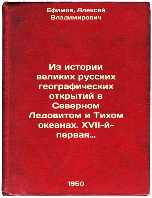 Short description: In Russian. Efimov, Alexey Vladimirovich. From the history of great Russian geographic discoveries in the Arctic and Pacific Oceans. Seventeenth-first half of the eighteenth century. Moscow: State Publishing House of Geographic Litas, 1950. Iz istorii velikikh russkikh geograficheskikh otkrytiy v Severnom Ledovitom i Tikhom okeanakh. XVII-y-pervaya polovina XVIII v. In Russian /From the history of great Russian geographic discoveries in the Arctic and Pacific Oceans. The seventeenth-first half of the eighteenth century . The image is provided for reference only. It may reflect condition of one of the available copies or only help in identifying the edition. Please feel free to contact us for a detailed description of the copies available. SKU4588025