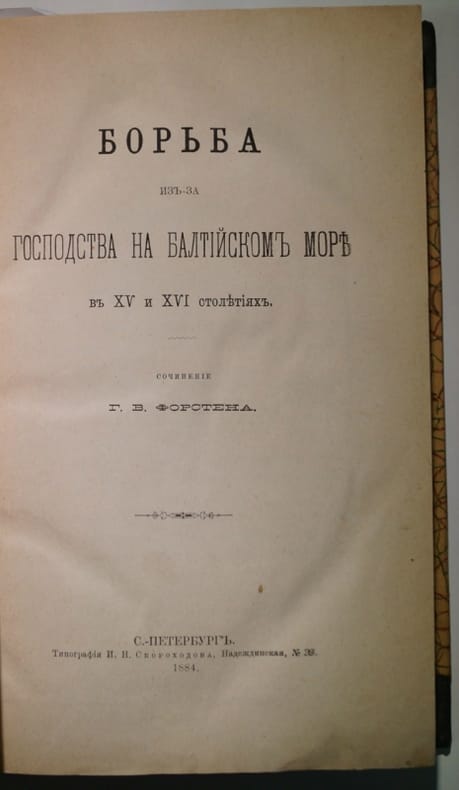 The struggle for domination of the Baltic Sea in the fifteenth and sixteenth centuries In Russian/Bor'ba iz-za gospodstva na Baltiyskom more v XV i XVI stoletiyakh. In Russian. Forsten, Georgy Vasilyevich. The struggle for dominance on the Baltic Sea in the fifteenth and sixteenth centuries. St. Petersburg: 1884, type. I.N. Skorokhodov The image is provided for reference only. It may reflect condition of one of the available copies or only help in identifying the edition. You are welcome to reach out to us for a detailed description of the copies currently available. Delivery of this book may take longer than usual including extended processing and pre-shipping time, no expedited shipping is available. Please advise us if you have a set date or a deadline to receive your order.SKU4637561