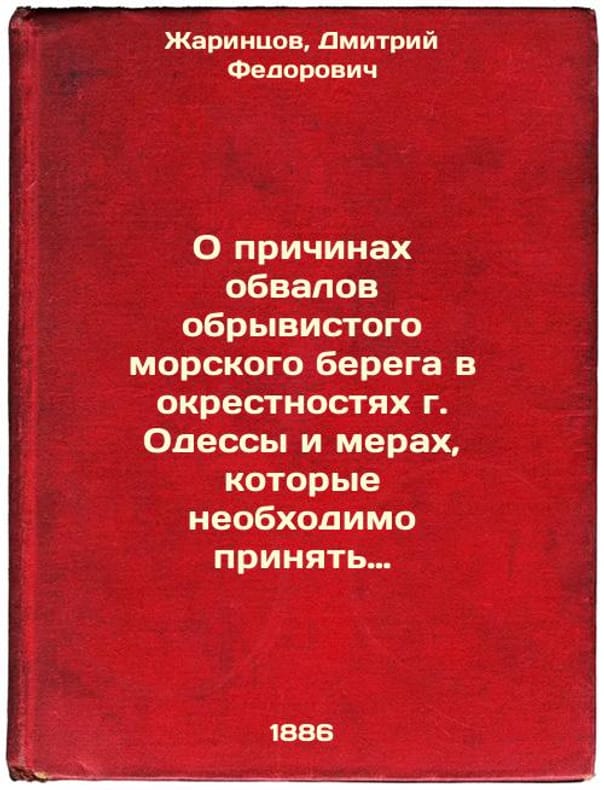 Short description: In Russian. Zharintsov, Dmitry Fedorovich. About the causes of the steep sea shore collapse in the vicinity of Odessa and the measures that need to be taken to prevent the shore collapse at the Odessa electric lighthouse. O prichinakh obvalov obryvistogo morskogo berega v okrestnostyakh g. Odessy i merakh, kotorye neobkhodimo prinyat' dlya preduprezhdeniya obrusheniya berega u odesskogo elektricheskogo mayaka. In Russian /About the causes of the steep sea shore collapse in the vicinity of Odessa and the measures that need to be taken to prevent the shore collapse at the Odessa electric lighthouse. The image is provided for reference only. It may reflect condition of one of the available copies or only help in identifying the edition. Please feel free to contact us for a detailed description of the copies available. SKU4644633
