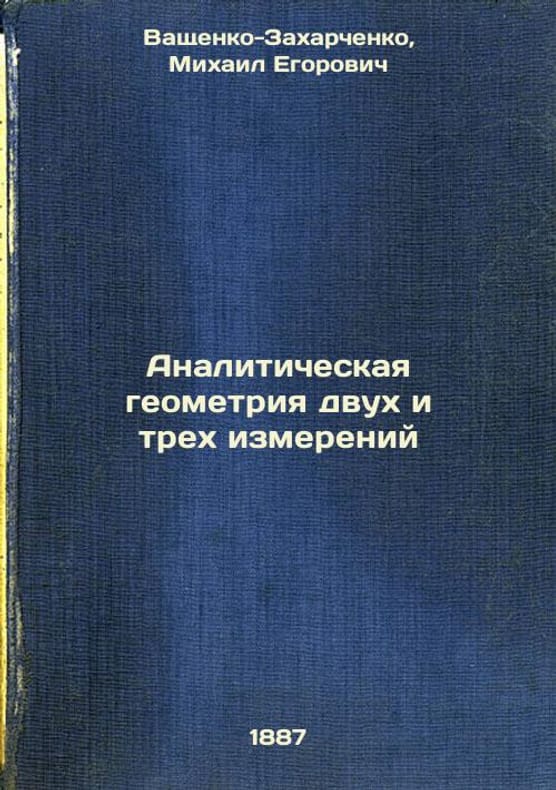 Short description: In Russian. Vashchenko-Zakharchenko, Mikhail Egorovich. Analytical geometry of two and three dimensions. Analiticheskaya geometriya dvukh i trekh izmereniy. In Russian /Analytical geometry of two and three dimensions. The image is provided for reference only. It may reflect condition of one of the available copies or only help in identifying the edition. Please feel free to contact us for a detailed description of the copies available. SKU4689109