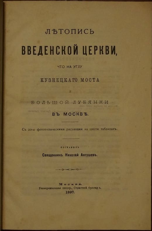 Short description: Chronicle of the Church of the Entry into the Church, at the corner of Kuznetsky Bridge and Bolshoi Lubyanka in Moscow In Russian/Letopis' Vvedenskoy tserkvi, chto na uglu Kuznetskogo mosta i Bol'shoy Lubyanki v Moskve. In Russian. Antushev, Nikolai. Chronicle of the Church of the Entry into the Church, at the corner of Kuznetsky Bridge and Bolshoi Lubyanka in Moscow. Moscow: 1897, Univ. Type. The image is provided for reference only. It may reflect condition of one of the available copies or only help in identifying the edition. Please feel free to contact us for a detailed description of the copies available. SKU4728111