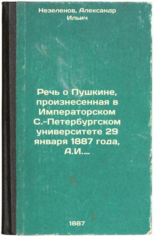 Short description: In Russian. Nezelenov, Alexander Ilyich. Speech on Pushkin, delivered at Imperial St. Petersburg University on January 29, 1887, by A.I. Nezelenov. Rech' o Pushkine, proiznesennaya v Imperatorskom S.-Peterburgskom universitete 29 yanvarya 1887 goda, A.I. Nezelenovym. In Russian /Speech on Pushkin delivered at Imperial St. Petersburg University on January 29, 1887, by A.I. Nezelenov. The image is provided for reference only. It may reflect condition of one of the available copies or only help in identifying the edition. Please feel free to contact us for a detailed description of the copies available. SKU4758668