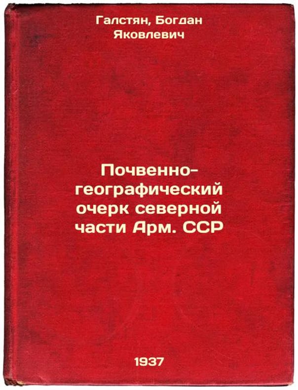 Short description: In Russian. Galstyan, Bogdan Yakovlevich. Soil and geography profile of the northern part of the Armenian SSR. Yerevan: Selkhozgiz, 1937. Pochvenno-geograficheskiy ocherk severnoy chasti ArmSSR. In Russian /Soil and geography profile of the northern part of the Armenian SSR. The image is provided for reference only. It may reflect condition of one of the available copies or only help in identifying the edition. Please feel free to contact us for a detailed description of the copies available. SKU5161958