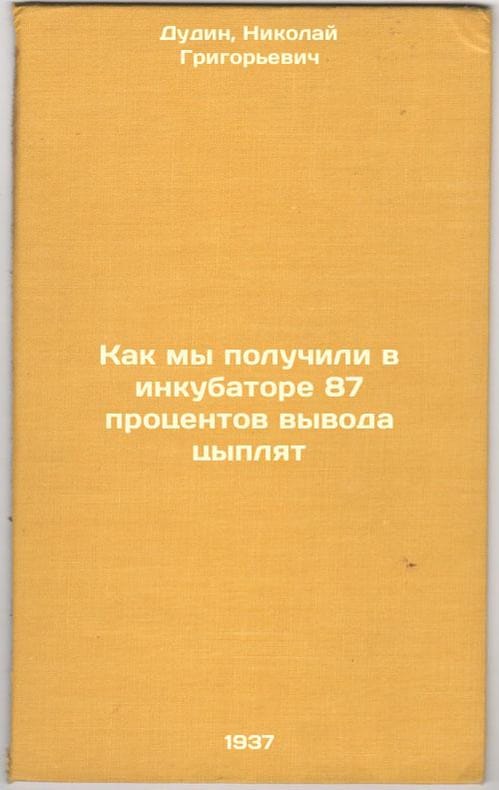 Short description: In Russian. Dudin, Nikolai Grigorievich. How we got 87 per cent of chick hatching in the incubator. Moscow: Agriculture, 1937: Model Type. Kak my poluchili v inkubatore 87 protsentov vyvoda tsyplyat. In Russian /How did we get 87 per cent of chick hatching in the incubator . The image is provided for reference only. It may reflect condition of one of the available copies or only help in identifying the edition. Please feel free to contact us for a detailed description of the copies available. SKU5163495