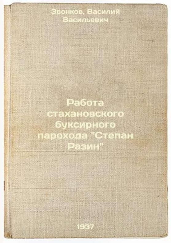 Short description: In Russian. Zvonkov, Vasily Vasilievich. Work of the Stakhanov tugboat Stepan Razin. Moscow: People's Commissary of the USSR, 1937: 5 type. Transjeldorizdat. Rabota stakhanovskogo buksirnogo parokhoda Stepan Razin. In Russian /Work of the Stakhanov tugboat Stepan Razin . The image is provided for reference only. It may reflect condition of one of the available copies or only help in identifying the edition. Please feel free to contact us for a detailed description of the copies available. SKU5164120