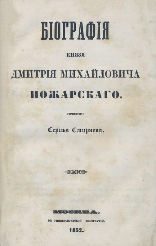 Short description: The biography of Prince Dmitry Mikhailovich Pozharsky In Russian/Biografiya knyazya Dmitriya Mikhaylovicha Pozharskogo. In Russian. Smirnov, Sergey Konstantinovich. Biography of Prince Dmitry Mikhailovich Pozharsky. Moscow: 1852, Univ. Type. The image is provided for reference only. It may reflect condition of one of the available copies or only help in identifying the edition. Please feel free to contact us for a detailed description of the copies available. SKU5200874