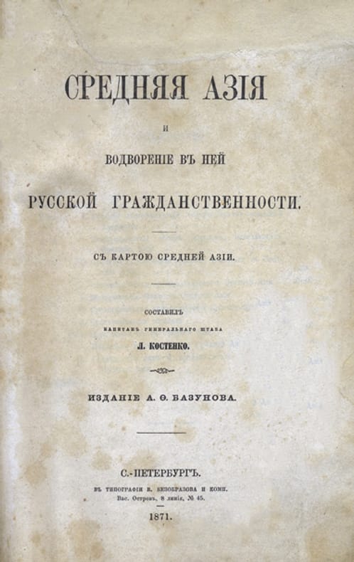 Short description: Central Asia and the introduction of Russian citizenship in it In Russian/Srednyaya Aziya i vodvorenie v ney russkoy grazhdanstvennosti. In Russian. Kostenko, Lev Feofilovich. Central Asia and the introduction of Russian citizenship in it. St. Petersburg: 1871, edition by A.F. Bazunov The image is provided for reference only. It may reflect condition of one of the available copies or only help in identifying the edition. Please feel free to contact us for a detailed description of the copies available. SKU5206146
