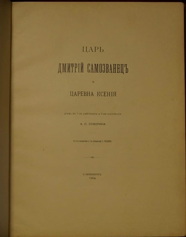 Short description: Tsar Dmitry the Imposter and Tsarina Ksenia In Russian/Tsar' Dmitriy Samozvanets i tsarevna Kseniya. In Russian. Suvorin, Alexey Sergeevich. Tsar Dmitry Samozvanets and Tsarevna Ksenia. St. Petersburg: 1904, type. A.S. Suvorina The image is provided for reference only. It may reflect condition of one of the available copies or only help in identifying the edition. Please feel free to contact us for a detailed description of the copies available. SKU5250863