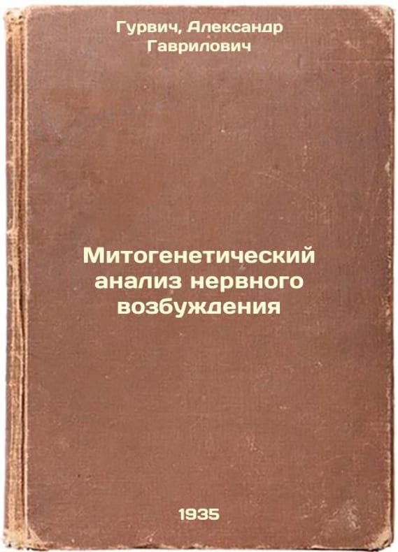 "Short description: In Russian. Gurvich, Alexander Gavrilovich. Mitogenetic Analysis of Nervous Excitation. Moscow; Leningrad: WIEM, 1935. Mitogeneticheskiy analiz nervnogo vozbuzhdeniya. In Russian /Mitogenetic analysis of nerve arousal . The image is provided for reference only. It may reflect condition of one of the available copies or only help in identifying the edition. Please feel free to contact us for a detailed description of the copies available. SKU5276918"
