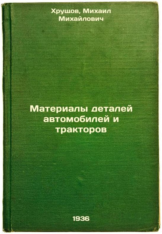 "Short description: In Russian. Khrushchov, Mikhail Mikhailovich. Materials of Automobile and Tractor Parts. Moscow; Leningrad: Onti. Editor-in-Chief of the AutoTract, 1936 (L: type named after Yevg. Sokolova). Materialy detaley avtomobiley i traktorov. In Russian /Materials of Automobile and Tractor Parts. The image is provided for reference only. It may reflect condition of one of the available copies or only help in identifying the edition. Please feel free to contact us for a detailed description of the copies available. SKU5315021"