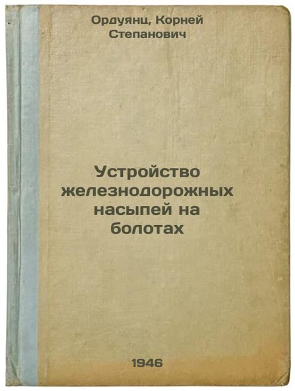 Short description: In Russian. Orduyants, Korney Stepanovich. Construction of railway embankments on marshes. Moscow: edition and type 1. Transjeldorizdat, 1946. Ustroystvo zheleznodorozhnykh nasypey na bolotakh. In Russian /Construction of railway embankments on marshes. The image is provided for reference only. It may reflect condition of one of the available copies or only help in identifying the edition. Please feel free to contact us for a detailed description of the copies available. SKU5855620