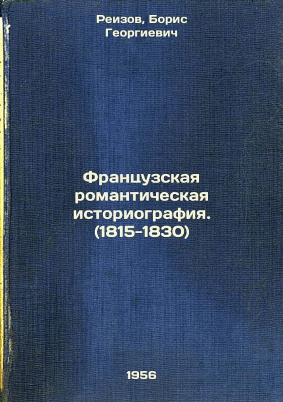 Short description: In Russian. Reizov, Boris Georgievich. French Romantic Historiography. (1815-1830). Leningrad: Publishing House of Leningrad, 1956. Frantsuzskaya romanticheskaya istoriografiya. (1815-1830). In Russian /French Romantic Historiography. (1815-1830) . The image is provided for reference only. It may reflect condition of one of the available copies or only help in identifying the edition. Please feel free to contact us for a detailed description of the copies available. SKU5905517