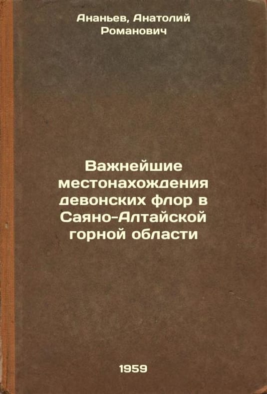 Short description: In Russian. Ananyev, Anatoly Romanovich. The most important locations of Devonian flora in the Sayano-Altai mountain region. Tomsk: Tomsk University Publishing House, 1959. Vazhneyshie mestonakhozhdeniya devonskikh flor v Sayano-Altayskoy gornoy oblasti. In Russian /Vital locations of Devonian flora in the Sayano-Altai mountain region . The image is provided for reference only. It may reflect condition of one of the available copies or only help in identifying the edition. Please feel free to contact us for a detailed description of the copies available. SKU5942137