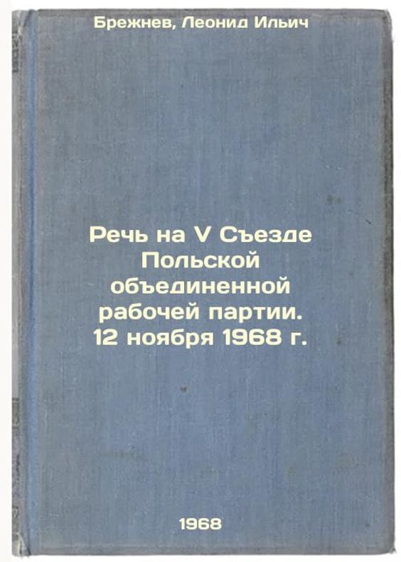 Short description: In Russian. Brezhnev, Leonid Ilyich. Speech at the Fifth Congress of the Polish United Workers Party. 12 November 1968 Moscow: Politizdat, 1968. Rech' na V Sezde Pol'skoy obedinennoy rabochey partii. 12 noyabrya 1968 g. In Russian /Speech at the Fifth Congress of the Polish United Workers Party. 12 November 1968 . The image is provided for reference only. It may reflect condition of one of the available copies or only help in identifying the edition. Please feel free to contact us for a detailed description of the copies available. SKU5985248