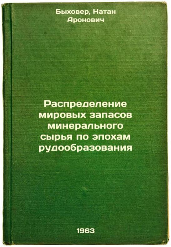 Short description: In Russian. Bykhover, Natan Aronovich. Distribution of world mineral reserves by epochs of ore formation. Moscow: State Geoltekhizdat, 1963. Raspredelenie mirovykh zapasov mineral'nogo syr'ya po epokham rudoobrazovaniya. In Russian /Distribution of World Mineral Reserves by Age of Mining . The image is provided for reference only. It may reflect condition of one of the available copies or only help in identifying the edition. Please feel free to contact us for a detailed description of the copies available. SKU5992314