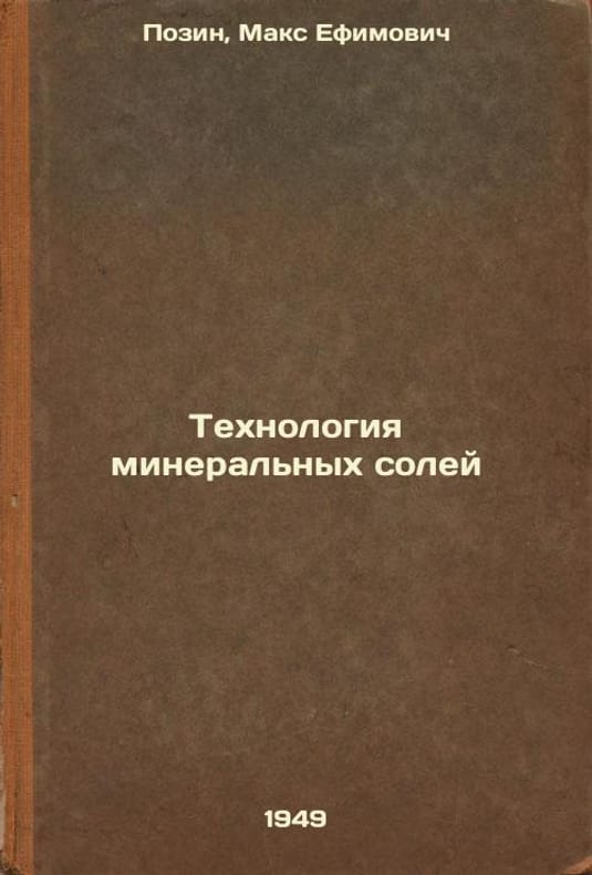 "Short description: In Russian. Pozin, Max Efimovich. Technology of mineral salts. Leningrad; Moscow: State Chemizdat (Leningrad: Sokolova type, 1949). The image is provided for reference only. It may reflect condition of one of the available copies or only help in identifying the edition. Please feel free to contact us for a detailed description of the copies available. SKU6004171"