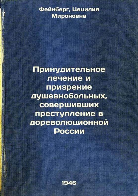 Short description: In Russian. Feinberg, Cecilia Mironovna. Compulsory treatment and care for the mentally ill who committed a crime in pre-revolutionary Russia. Moscow: 1946. Prinuditel'noe lechenie i prizrenie dushevnobol'nykh, sovershivshikh prestuplenie v dorevolyutsionnoy Rossii. In Russian /Compulsory treatment and care for the mentally ill who committed a crime in pre-revolutionary Russia . The image is provided for reference only. It may reflect condition of one of the available copies or only help in identifying the edition. Please feel free to contact us for a detailed description of the copies available. SKU6043574