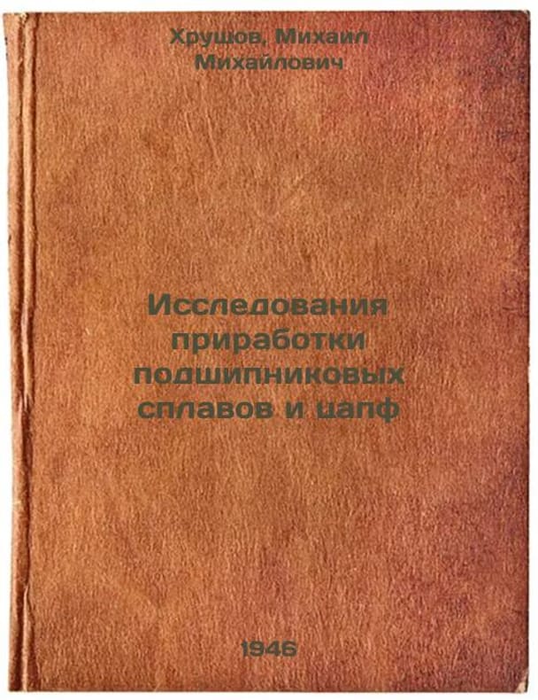 "Short description: In Russian. Khrushchov, Mikhail Mikhailovich. Research into the burnishing of bearing alloys and studs. Moscow; Leningrad: Publishing House of Akad. sciences of the USSR (Leningrad: type. Print Dvor, 1946). Issledovaniya prirabotki podshipnikovykh splavov i tsapf. In Russian /Research into the burnishing of bearing alloys and studs. The image is provided for reference only. It may reflect condition of one of the available copies or only help in identifying the edition. Please feel free to contact us for a detailed description of the copies available. SKU6048333"