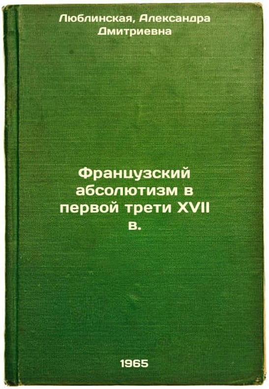 "Short description: In Russian. Lyublinskaya, Alexandra Dmitrievna. French absolutism in the first third of the seventeenth century, Moscow; Leningrad: Science. Leningrad Division, 1965. Frantsuzskiy absolyutizm v pervoy treti XVII v. In Russian /French absolutism in the first third of the seventeenth century . The image is provided for reference only. It may reflect condition of one of the available copies or only help in identifying the edition. Please feel free to contact us for a detailed description of the copies available. SKU6335171"