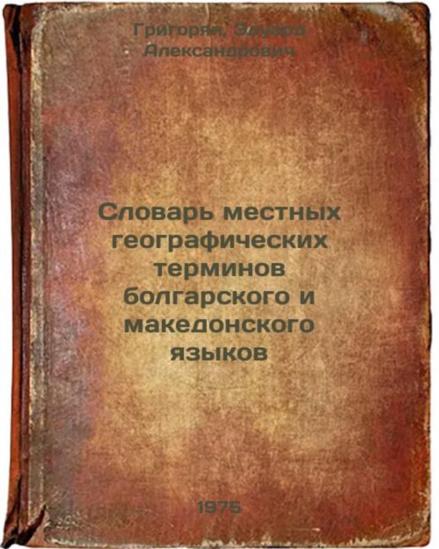 Short description: In Russian. Grigoryan, Eduard Alexandrovich. Dictionary of local geographical terms of Bulgarian and Macedonian languages. Yerevan: Ayastan, 1975. Slovar' mestnykh geograficheskikh terminov bolgarskogo i makedonskogo yazykov. In Russian /Dictionary of Local Geographical Terms in Bulgarian and Macedonian. The image is provided for reference only. It may reflect condition of one of the available copies or only help in identifying the edition. Please feel free to contact us for a detailed description of the copies available. SKU6923144