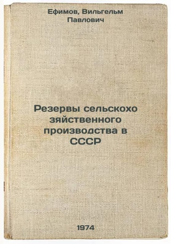 Short description: In Russian. Efimov, Wilhelm Pavlovich. Reserves of agricultural production in the USSR. Moscow: Statistics, 1974. Rezervy sel'skokhozyaystvennogo proizvodstva v SSSR. In Russian /Reserves of agricultural production in the USSR. The image is provided for reference only. It may reflect condition of one of the available copies or only help in identifying the edition. Please feel free to contact us for a detailed description of the copies available. SKU7043240
