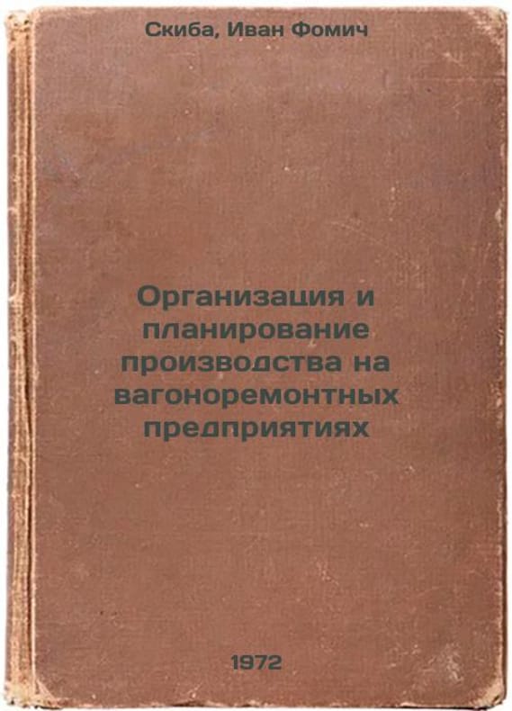 Short description: In Russian. Skiba, Ivan Fomich. Organization and planning of production at car repair enterprises. Moscow: Transport, 1972. Organizatsiya i planirovanie proizvodstva na vagonoremontnykh predpriyatiyakh. In Russian/Organization and planning of production in wagon repair enterprises. The image is provided for reference only. It may reflect condition of one of the available copies or only help in identifying the edition. Please feel free to contact us for a detailed description of the copies available. SKU7446086