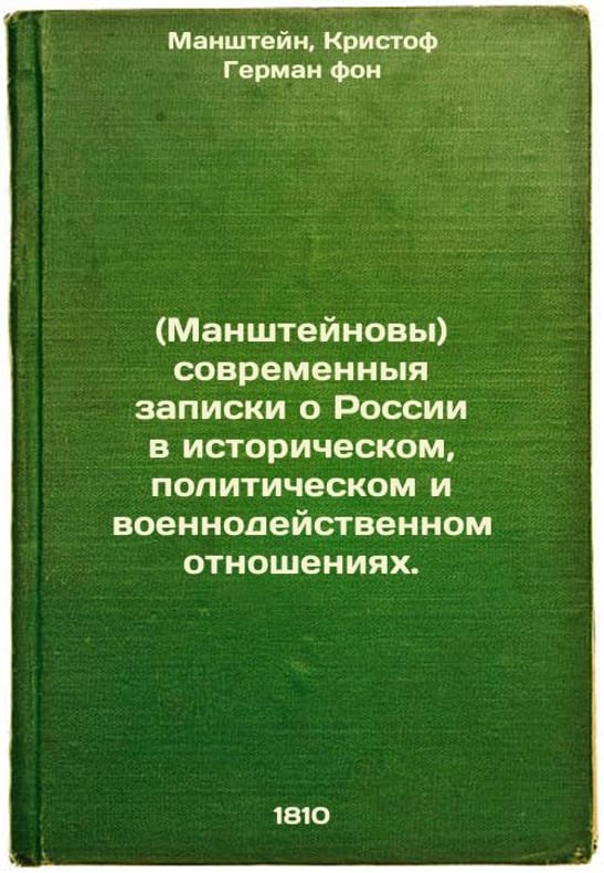 Short description: In Russian. Manstein, Christoph Hermann von. (Manshteinov's) contemporary notes about Russia in historical, political, and military relations. Derpt: In the University Printing House of M. Grencius, 1810. Manshteynovy sovremennyya zapiski o Rossii v istoricheskom, politicheskom i voennodeystvennom otnosheniyakh. In Russian /Manshteinov's contemporary notes on Russia in historical, political, and military terms.. The image is provided for reference only. It may reflect condition of one of the available copies or only help in identifying the edition. Please feel free to contact us for a detailed description of the copies available. SKU7495226