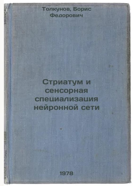 Short description: In Russian. Tolkunov, Boris Fedorovich. Striatum and sensory specialization of the neural network. Leningrad: Science. Leningrad Division, 1978 Striatum i sensornaya spetsializatsiya neyronnoy seti/The striatum and the sensory specialization of the neural network In Russian. The image is provided for reference only. It may reflect condition of one of the available copies or only help in identifying the edition. Please feel free to contact us for a detailed description of the copies available. SKU7639361
