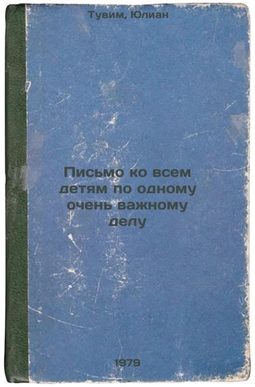 Short description: In Russian. Tuvim, Julian. A letter to all the children on one very important matter. Moscow: The Kid, 1979 Pismo ko vsem detyam po odnomu ochen vazhnomu delu/A letter to all children in one very important case In Russian. The image is provided for reference only. It may reflect condition of one of the available copies or only help in identifying the edition. Please feel free to contact us for a detailed description of the copies available. SKU8422064