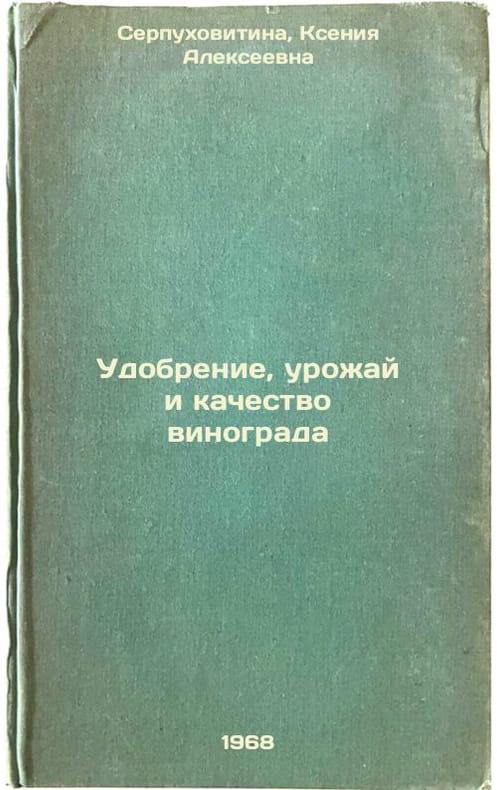 Short description: In Russian. Serpukhovitina, Ksenia Alekseevna. Fertilizer, Harvest, and Grape Quality. Krasnodar: Book of Books, 1968. Udobrenie, urozhay i kachestvo vinograda. In Russian /Fertilizer, Harvest and Grape Quality . The image is provided for reference only. It may reflect condition of one of the available copies or only help in identifying the edition. Please feel free to contact us for a detailed description of the copies available. SKU8429227