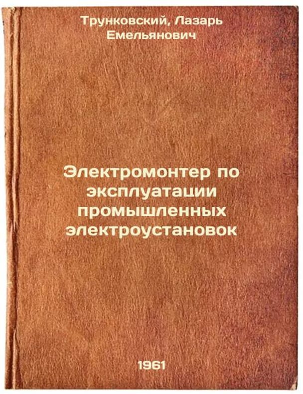 Short description: In Russian. Trunkovsky, Lazar Emelyanovich. Electrician for the operation of industrial electrical installations. Moscow: Proftekhizdat, 1961. Elektromonter po ekspluatatsii promyshlennykh elektroustanovok. In Russian /Industrial Electrical Installation Electrician . The image is provided for reference only. It may reflect condition of one of the available copies or only help in identifying the edition. Please feel free to contact us for a detailed description of the copies available. SKU8459393