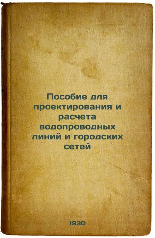 "Short description: In Russian. Briling, Sergei Romanovich. Manual for designing and calculating water supply lines and urban networks. Moscow; Leningrad: State Publishing House, 1930. Posobie dlya proektirovaniya i rascheta vodoprovodnykh liniy i gorodskikh setey. In Russian /Tool for designing and calculating water lines and urban networks. The image is provided for reference only. It may reflect condition of one of the available copies or only help in identifying the edition. Please feel free to contact us for a detailed description of the copies available. SKU9014233"