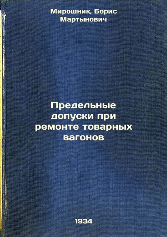 Short description: In Russian. Miroshnik, Boris Martynovich. Limit tolerances for the repair of wagons. Moscow: edition and type 1. Transjeldorizdat, 1934. Predel'nye dopuski pri remonte tovarnykh vagonov. In Russian /Limit tolerances for repair of wagons . The image is provided for reference only. It may reflect condition of one of the available copies or only help in identifying the edition. Please feel free to contact us for a detailed description of the copies available. SKU9314679