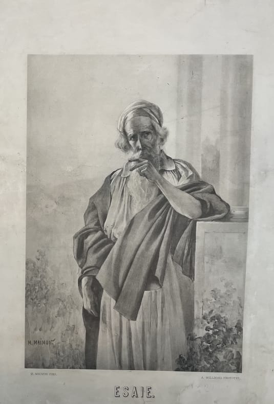 Moisei (Moses) Maimon, Isaiah. From the album Men of the Bible. St. Petersburg, A. Willborg, 1897. Lithography (phototype) on paper. Size: 48.8x34 cm (23.5x34 cm). Moisei Maimon (1860 1924) was a Jewish - Russian painter who was born in the Augustow Governorate, then part of the Russian Empire (present-day Lithuania). He was among the first known artists within the Jewish community of Russia. He was also the grandson of author Alexander Ziskind Maimon. In 1880 he was admitted to the Imperial Academy of Arts in St. Petersburg. Maimon graduated from the academy in 1883. In later years he was a member of the Society for the Encouragement of Jewish Arts, which was established in St. Peterburg in 1916. In 1893, for the painting Marranos (Secret Seider in Spain during the Inquisition) he was elected an academician of portrait and historical painting. He painted pictures on historical and biblical subjects, portraits. Executed and published graphic albums Biblical Women, Men of the Bible, Pictures of Jewish Life (1894-1900). Since 1887 - participant of exhibitions. He exhibited his works at exhibitions in the halls of the Imperial Academy of Arts (1888-1918, with interruptions), the Community of Artists (1917), the World Exhibition in St. Louis (1904), the 1st State Free Exhibition of Works of Art in Petrograd (1919). Board member of the Jewish Society for the Encouragement of Artists (19161919). His work was internationally known at his lifetime. Nine of Maimon's works were shown at the Russian exhibition at the St. Louis World's fair in 1904. Some of his work was shown at the JSEA's exhibition in 1916 - 1917., SKUKAZ000014-G kaz_gr