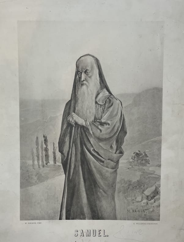 Moisei (Moses) Maimon, Samuel. From the album Men of the Bible. St. Petersburg, A. Willborg, 1897. Lithography (phototype) on paper. Size: 48.5x34 cm (23.5x33 cm). Moisei Maimon (1860 1924) was a Jewish - Russian painter who was born in the Augustow Governorate, then part of the Russian Empire (present-day Lithuania). He was among the first known artists within the Jewish community of Russia. He was also the grandson of author Alexander Ziskind Maimon. In 1880 he was admitted to the Imperial Academy of Arts in St. Petersburg. Maimon graduated from the academy in 1883. In later years he was a member of the Society for the Encouragement of Jewish Arts, which was established in St. Peterburg in 1916. In 1893, for the painting Marranos (Secret Seider in Spain during the Inquisition) he was elected an academician of portrait and historical painting. He painted pictures on historical and biblical subjects, portraits. Executed and published graphic albums Biblical Women, Men of the Bible, Pictures of Jewish Life (1894-1900). Since 1887 - participant of exhibitions. He exhibited his works at exhibitions in the halls of the Imperial Academy of Arts (1888-1918, with interruptions), the Community of Artists (1917), the World Exhibition in St. Louis (1904), the 1st State Free Exhibition of Works of Art in Petrograd (1919). Board member of the Jewish Society for the Encouragement of Artists (19161919). His work was internationally known at his lifetime. Nine of Maimon's works were shown at the Russian exhibition at the St. Louis World's fair in 1904. Some of his work was shown at the JSEA's exhibition in 1916 - 1917., SKUKAZ000017-G kaz_gr