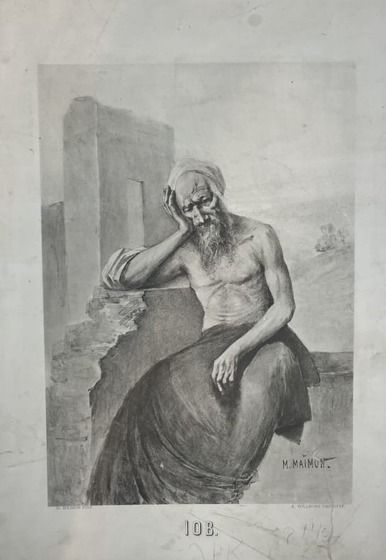 Moisei (Moses) Maimon, Job. From the album Men of the Bible. St. Petersburg, A. Willborg, 1897. Lithography (phototype) on paper. Size: 48.5x34 cm (23.5x33.5 cm). Moisei Maimon (1860 1924) was a Jewish - Russian painter who was born in the Augustow Governorate, then part of the Russian Empire (present-day Lithuania). He was among the first known artists within the Jewish community of Russia. He was also the grandson of author Alexander Ziskind Maimon. In 1880 he was admitted to the Imperial Academy of Arts in St. Petersburg. Maimon graduated from the academy in 1883. In later years he was a member of the Society for the Encouragement of Jewish Arts, which was established in St. Peterburg in 1916. In 1893, for the painting Marranos (Secret Seider in Spain during the Inquisition) he was elected an academician of portrait and historical painting. He painted pictures on historical and biblical subjects, portraits. Executed and published graphic albums Biblical Women, Men of the Bible, Pictures of Jewish Life (1894-1900). Since 1887 - participant of exhibitions. He exhibited his works at exhibitions in the halls of the Imperial Academy of Arts (1888-1918, with interruptions), the Community of Artists (1917), the World Exhibition in St. Louis (1904), the 1st State Free Exhibition of Works of Art in Petrograd (1919). Board member of the Jewish Society for the Encouragement of Artists (19161919). His work was internationally known at his lifetime. Nine of Maimon's works were shown at the Russian exhibition at the St. Louis World's fair in 1904. Some of his work was shown at the JSEA's exhibition in 1916 - 1917., SKUKAZ000019-G kaz_gr