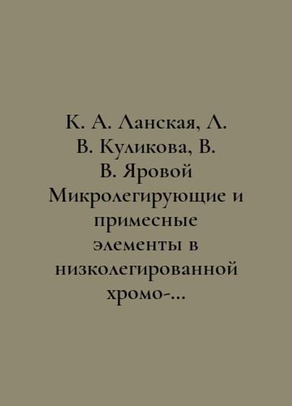 K. A. Lanskaya, L. V. Kulikova, V. V. Yarovaya Microalloying and impurity elements in low-alloy chromo-crimson-vanadium steel (Microalloying and impurity elements in low-alloying Cr.Mo.V steel) In Russian /K. A. Lanskaya, L. V. Kulikova, V. V. Yarovoy Mikrolegiruyushchie i primesnye elementy v nizkolegirovannoy khromo-malibdeno-vanadievoy stali (Mikrolegiruyushchie i primesnye elementy v nizkolegirovannoy Cr.Mo.V stali) Moscow: Metallurgiya 1989. 174You are welcome to reach out to us for a detailed description of the copies currently available. Delivery of this book may take longer than usual including extended processing and pre-shipping time, no expedited shipping is available. Please advise us if you have a set date or a deadline to receive your order. SKUalb0187ed97bb346863
