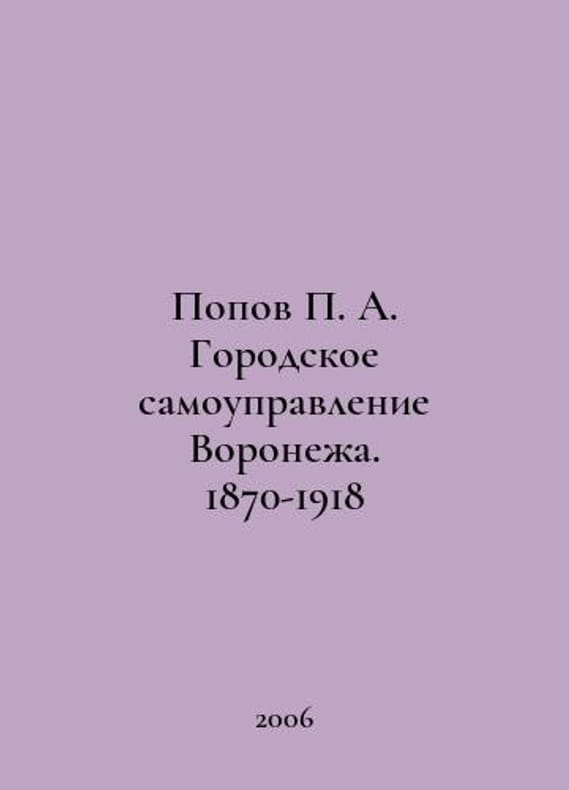Popov A. City Government of Voronezh. 1870-1918 In Russian /Popov A. Gorodskoe samoupravlenie Voronezha. 1870-1918 Voronezh Kvarta. 2006. You are welcome to reach out to us for a detailed description of the copies currently available. Delivery of this book may take longer than usual including extended processing and pre-shipping time, no expedited shipping is available. Please advise us if you have a set date or a deadline to receive your order.SKUalb018931c433bdcbf0